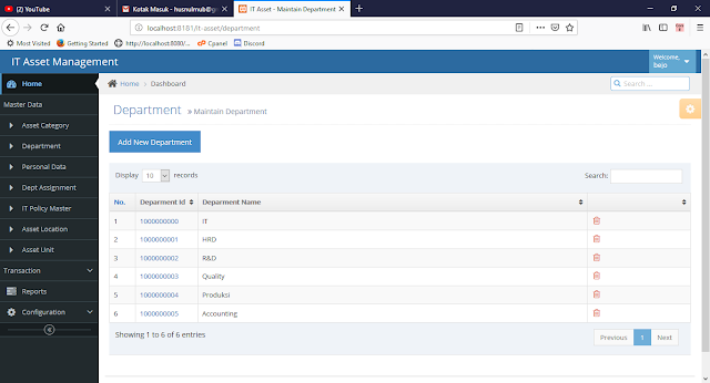 Pada postingan kali saya akan share sebuah aplikasi IT Asset management yang fungsinya untuk memonitoring semua Asset khusus IT, contohnya : Laptop/komputer, Printer, Router, Hardisk, dll. Dalam aplkasi ini kita bisa mengetahui Asset IT posisinya dimana dan digunakan oleh siapa.